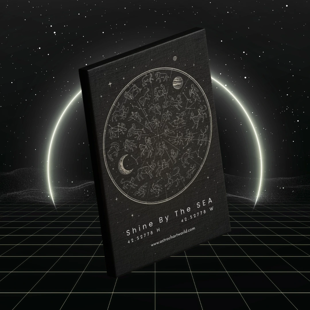 An elegant black canvas featuring your personalized celestial map — a timeless interpretation of the sky’s grand design at the moment your story began. With its deep black background and refined detailing, this piece captures the quiet majesty of the cosmos in a classic, enduring style.