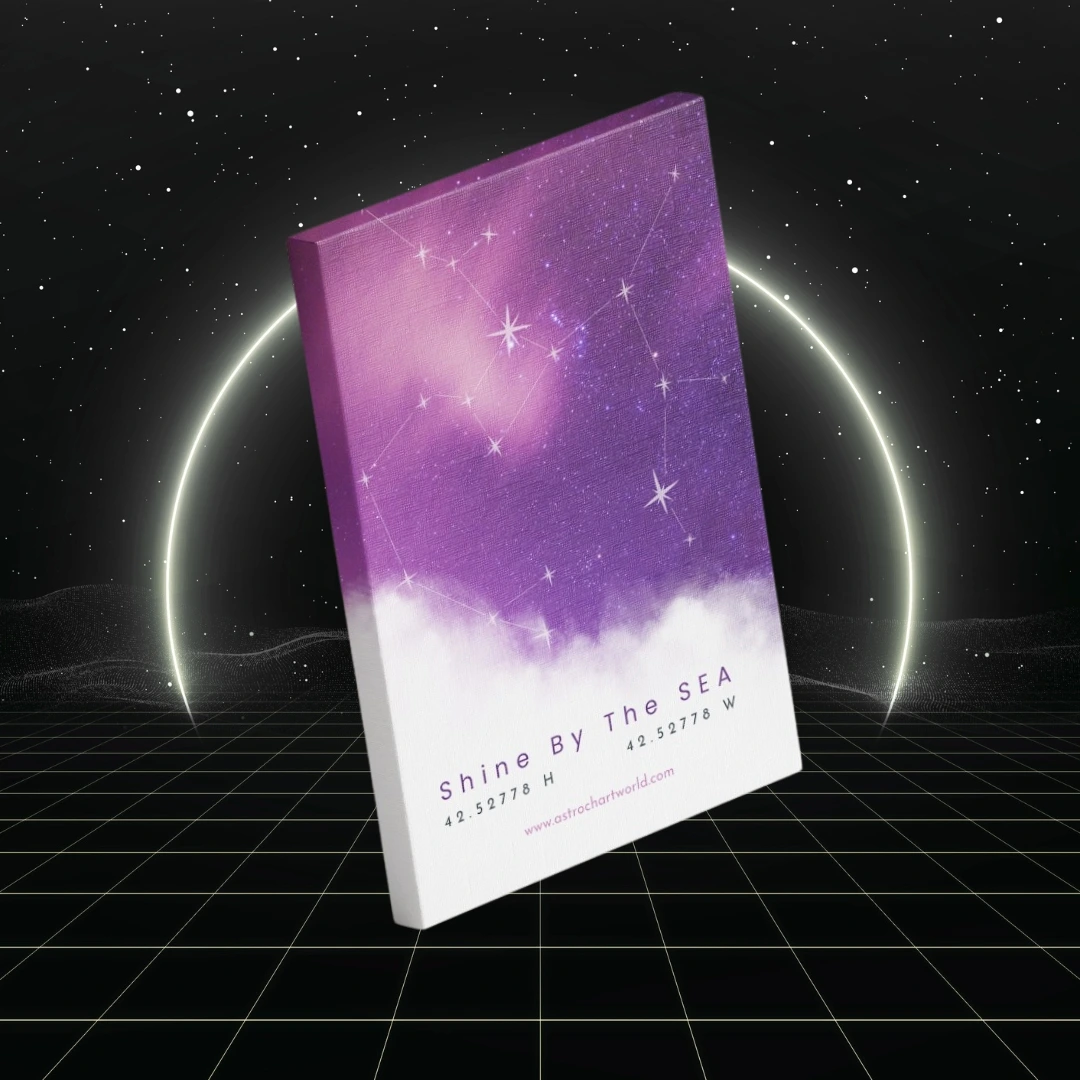 A stunning violet-toned canvas featuring your personalized celestial map — a visual snapshot of the sky at the exact moment your story began. Printed on high-quality, gallery-style canvas, this artwork blends cosmic beauty with modern elegance, adding a serene and meaningful touch to any space.